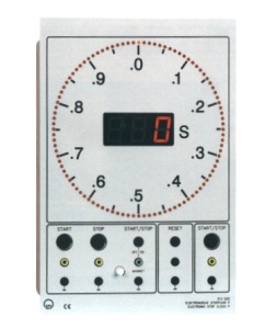 Dígitos 25 mm, base t: cuarzo. Indicador 100 díodos luminosos en su esfera de 17 cm Ø. 0 - 99'99 s / 0,01 s, Start / Stop entradas para control exterior por barreras o impulsos de circuitos eléctricos. Salida para imán de retención.