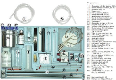 Con 35 componentes: desde tubo termométrico sin graduar hasta calorímetro de Joule, junto con aparatos de vidrio (matráz, vaso probeta, etc), rejilla, aros, tubos de Fe, Al, tubos de plástico, cuerpos de Al y Fe para calores específicos, cuerpo para radiación térmica, etc.