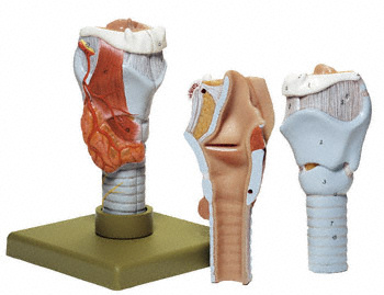 Tamaño natural, moldeado en SOMSO-Plast. Esqueleto cartilaginoso, ligamentos, membrana mucosa y glándula tiroidea. En 2 piezas, con base