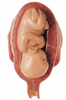 Tamaño natural, moldeado en SOMSO-Plast. Feto en posición normal, y removible del útero. En 2 piezas, con base