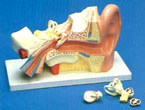 Conducto auditivo externo, oreja mediana e interna, la membrana del tímpano con el martillo, el estribo y el caracol.