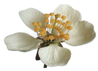 Prunus avium - Modelo aumentado 9x, moldeado en SOMSO-Plast. Una parte del cáliz con sépalo, 2 pétalos y un grupo de estambres son desmontables, muestran el medio ovario no unido al receptáculo, característica típica de los prunoideae. Consta de 3 piezas.