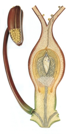 Tipo polygonum, ampliada 300x, moldeada en SOMSO-Plast. Ovario con polen en germinación y saco embrional en sección longitudinal, estambres con polen en sección sagital. Representación de la estructura fina microscópica en todos sus detalles.