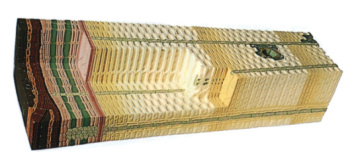 Ampliada 350x, moldeada en SOMSO-Plast. Muestra la estructura fina de la madera del pino en diferentes secciones: sección transversal, sección longitudinal radial, sección longitudinal tangencial a través de la zona generatriz, leño tardío, leño temprano, y ritidoma. Representación de todos los componentes del cuerpo leñoso. Una pieza.