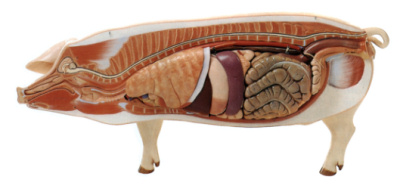 mitad derecha e izquierda del cuerpo, mitad izquierda de la cabeza, glándula parótida, pierna delantera izquierda, pulmón, corazón (2 partes), hígado (2 partes), estómago (2 partes), páncreas, intestino delgado, intestino grueso, perinefrio y mitad del útero