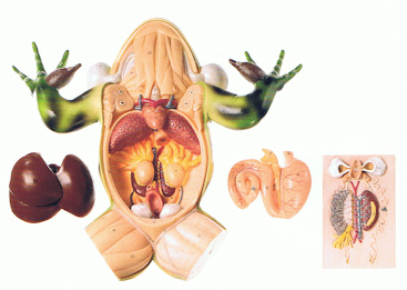 Montada con su parte dorsal sobre la placa soporte, muestra la preparación anatómica abierta de la parte abdominal de una rana masculina