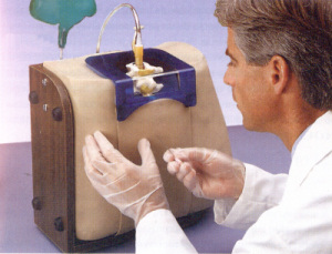 Esta reproducción exacta de la parte inferior de la espalda, con columna vertebral y elemento postizo de médula espinal, garantiza la resistencia adecuada para realizar la punción con aguja como así también la palpación exacta de los puntos de orientación, El simulador permite practicar las diversas técnicas de inyecciones espinales, epidurales, caudales, sacrales y lumbares. La columna vertebral se puede llenar con líquido a fin de simular el líquido cefalorraquídeo. Además el simulador se puede poner en posición sentada y tumbada de lado. La sección funcional del simulador comprende las vértebras lumbares 3-5 así como el hueso sacro y el coxis. Suministro con botella de líquido.