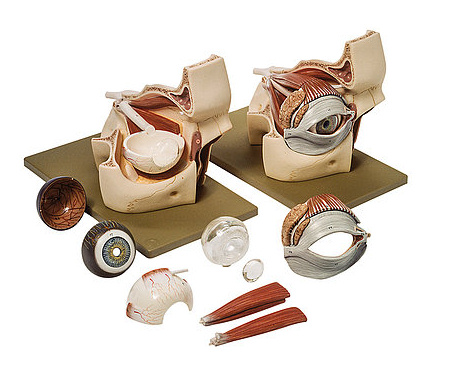 Desmontable en 9 partes: músculos oculares rectos superior y exterior, mitad superior de la membrana esclerótica, membrana coroidal y retina (2), humor vítreo, lente, órgano lacrimal y párpado