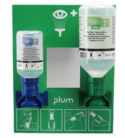 Estación de emergencia con dos botellas lavaojos: una de 500ml con solución salina y otra de 200ml, pH neutro