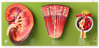 Modelo combinado del riñón derecho (aumentado 3 veces), del nefrón (aumentado 120 veces) y de los corpúsculos renales (aumentados 700