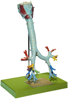 La tráquea muestra su estructura, bifurcación en los bronquios principales y división en los bronquios lobulares.