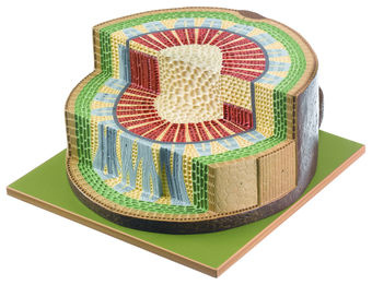 Seccion transversal, seccion radial longitudinal y tangential longitudinal a traves de un tallo de un ano