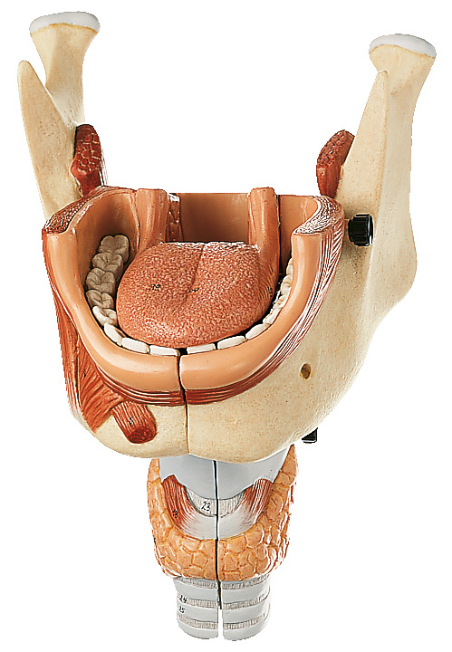 Separable en 5 partes: mandíbula derecha con laringe, laringe izquierda y mandíbula izquierda (2), lengua y musculatura e la faringe