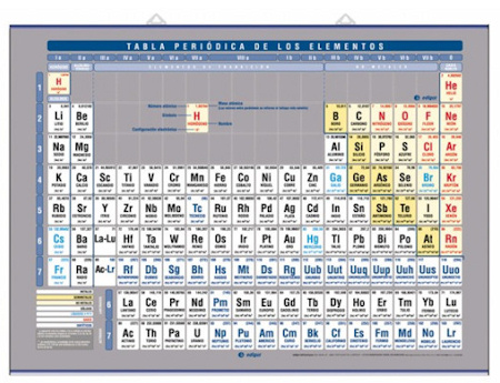 Información representada: El anverso de la tabla periódica muestra de forma clara y didáctica las principales características de los elementos químicos según sus estados (sólido, líquido, ...) y grupos (metales, semimetales, ...) a los que pertenecen.