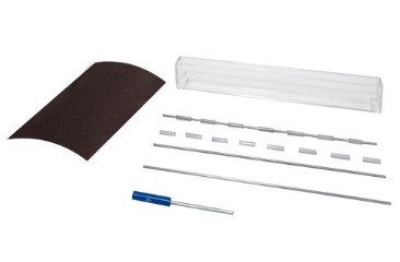1 cubeta de plexiglas, 3 varas de hierro, 1 electrodo de zinc, 15 fundas para el aislamiento de cada una de las varas de hierro, 1 papel esmeril, instrucciones detalladas para realizar el experimento.
