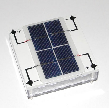 Con cuatro células solares de silicio conectadas en pares en serie; para convertir la luz en energía eléctrica.