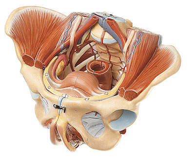 Representación de los órganos genitales externos e internos con los músculos pélvicos y los músculos del suelo pélvico, así como la red de nervios y vasos.